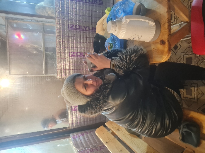 A person in a gray beanie and black fur-trimmed coat sits at a wooden table. They are holding a phone. A white jug, blue plastic bag, and black bowl are on the table. The setting appears to be indoors, with insulation visible on the wall behind the person. A window is to the left. The floor has a patterned tile. A red seat cushion is visible in the background.