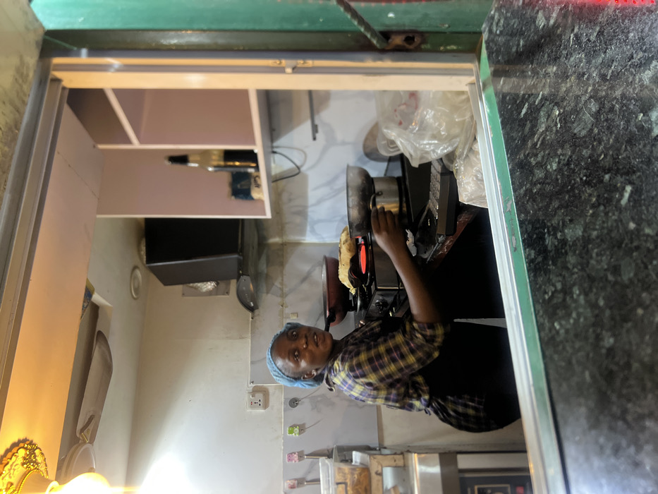 A woman with a blue head covering wearing a plaid shirt and apron stirs a pot on a stove
