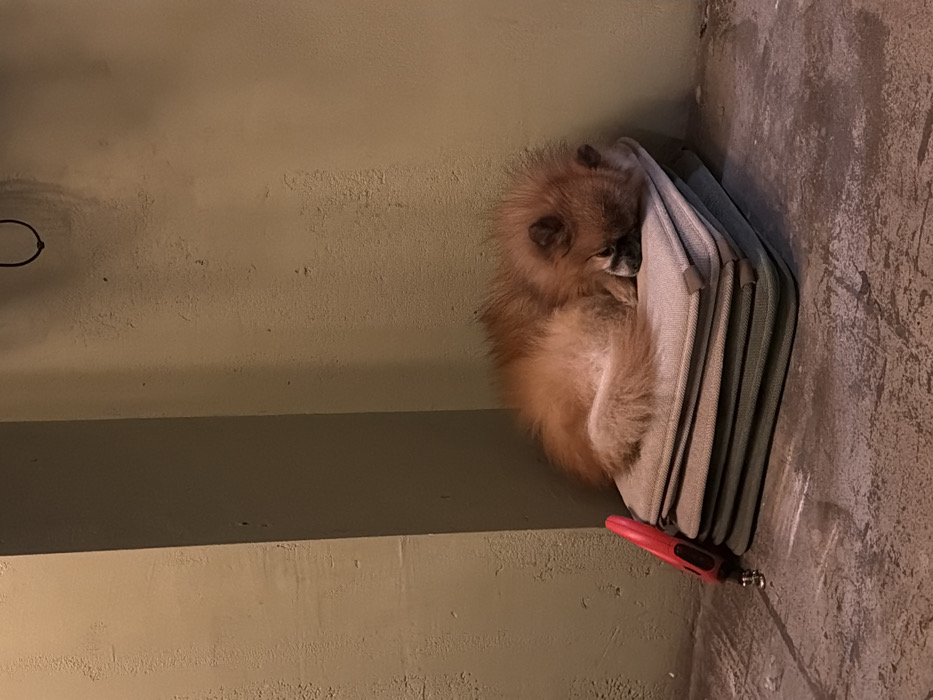- "A small, fluffy reddish-brown Pomeranian dog is observed sleeping curled up on a stack of four light-colored cushions in a corner" by FM-s9xhH3, licensed under CC BY 4.0