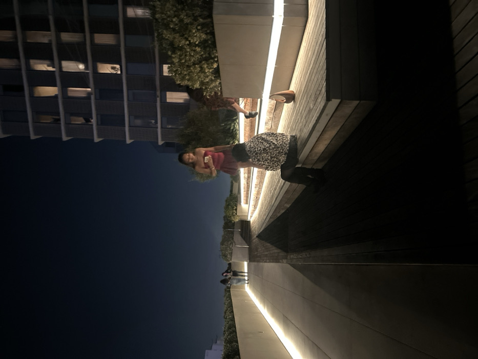 A woman in a red dress holds a phone while another woman in a leopard-print top kneels, possibly taking a picture. They are on a wooden deck with embedded lights, with a building visible in the background at night. Two additional people are farther away on the same level. A pair of shoes is on the deck near the first woman.