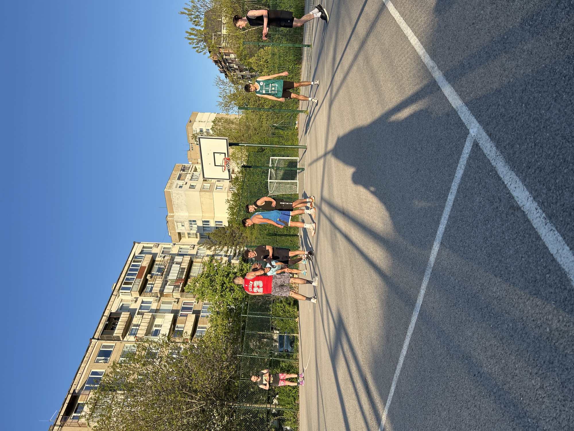 group of people on a basketball court in Sofia, Bulgaria. There are 8 people visible in the image. The setting is a paved basketball court with white lines and a basketball hoop. Behind the court, there are trees and buildings characteristic of a residential area in Sofia. The weather appears sunny and shadows are cast by the individuals. Some of the individuals are standing and appear to be talking, while one is jumping. They are all casually dressed. A soccer goal appears behind the basketball hoop.