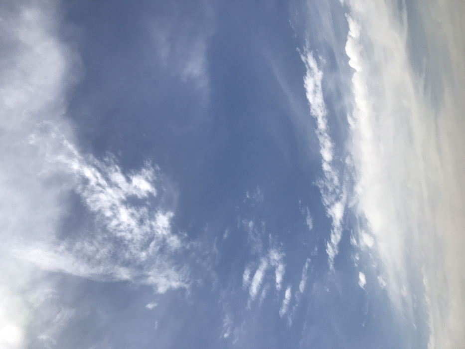 The image displays a daytime sky over Jos, Nigeria. The scene is dominated by a light to medium blue sky, indicating clear atmospheric conditions in portions of the frame. Scattered throughout the sky are various formations of white and light grey clouds. In the upper left quadrant, a prominent, wispy formation of cirrus-type clouds is visible. Elsewhere in the upper and middle sections, smaller, more fragmented white clouds, consistent with cumulus or cirrocumulus, are interspersed against the blue. The lower third of the image features a denser, more continuous band of clouds, appearing as stratocumulus or altostratus, with variations in thickness and opacity from white to light grey. No ground features, structures, people, or objects are visible, the entire frame being dedicated to the sky and cloud cover.