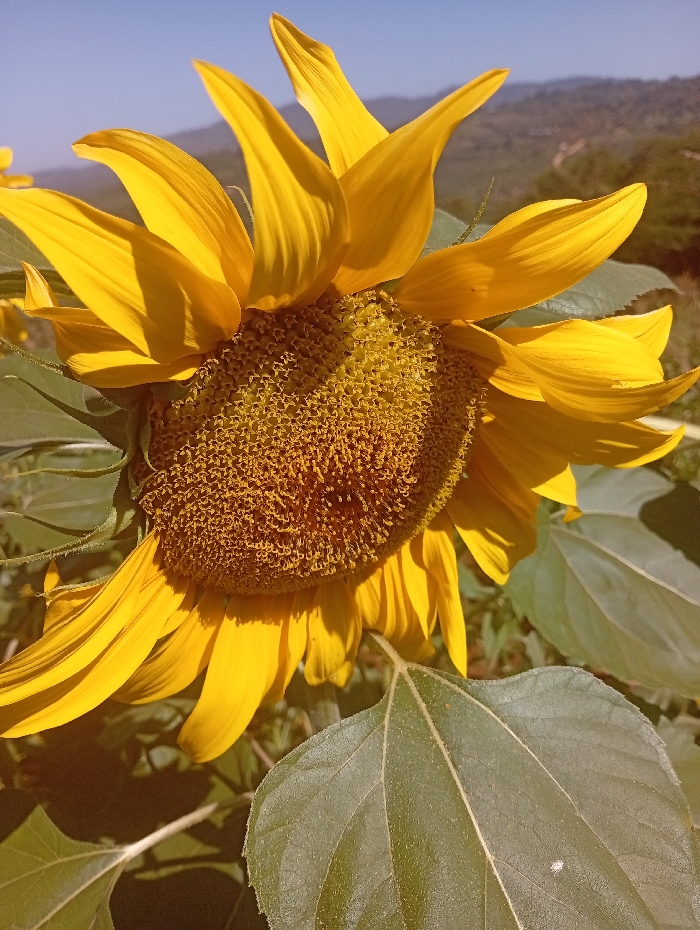 A sunflower dominates the frame, its golden petals boldly unfurling against a clear blue sky. The central disk is densely packed with intricate patterns. Lush green leaves frame the bottom of the image, offering a contrast to the vibrant yellow. Faint outlines of distant hills and trees appear in the background, hinting at a rural setting. The sunflower seems to bask in sunlight, creating a warm, natural scene.
