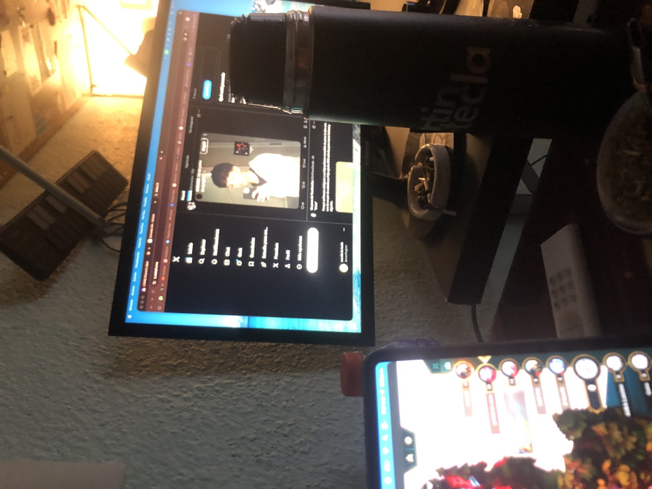 The scene depicts an indoor environment, specifically a desk setup in what appears to be a room within Beccar, Argentina. The prominent objects include a computer monitor displaying a social media interface, a mobile device, a thermos, an ashtray, a mate cup, and a remote control. On the desk, a black computer monitor is positioned centrally, displaying a dark-themed social media application (identified by the 'X' logo). The screen shows a profile featuring a young male in a selfie, holding a phone. Text on the screen includes "Rovix" and mentions "beccar," corroborating the stated location. To the left, a mobile tablet or large smartphone lies horizontally, displaying a colorful game interface or application with numerous circular icons and detailed graphics. To the right of the monitor, a tall, dark-colored thermos bottle, marked with "martin tecla," stands upright, partially obscuring the monitor's right edge. Below it, a traditional mate cup containing yerba mate and a bombilla is visible in the foreground. Between the thermos and the monitor stand, a white ceramic ashtray holds several cigarette butts and ash. A white remote control rests on the desk in front of the mobile device. The background consists of a light-colored, textured wall. In the upper right corner, a bright, warm-toned light source, possibly a lamp or window, illuminates the area, casting an orange glow. Above the monitor, some dark, rectangular structures, potentially shelves or brackets, are mounted on the wall. No individuals are directly visible, but the arrangement of items suggests recent human presence and activity involving leisure and consumption.