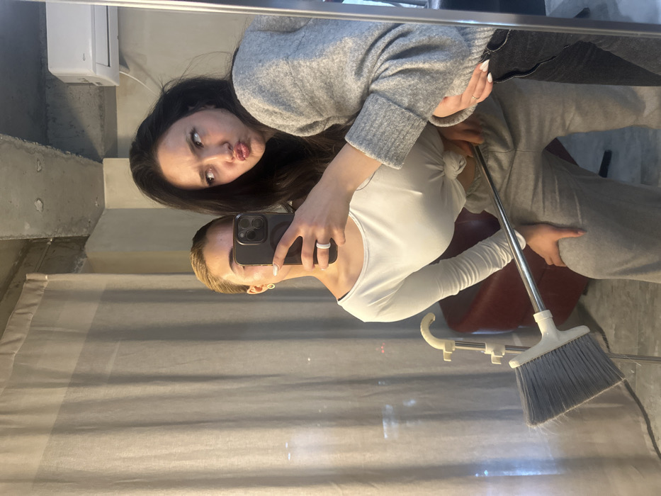 A mirror selfie depicts two women. One with long dark hair makes a kissing face. The other, presumably holding the phone, has short blonde hair. The first woman wears a grey sweater and black pants, while the second sports a white long-sleeved shirt and grey sweatpants. A broom leans against the mirror. The background includes a concrete structure, a curtain, and a white air conditioning unit.