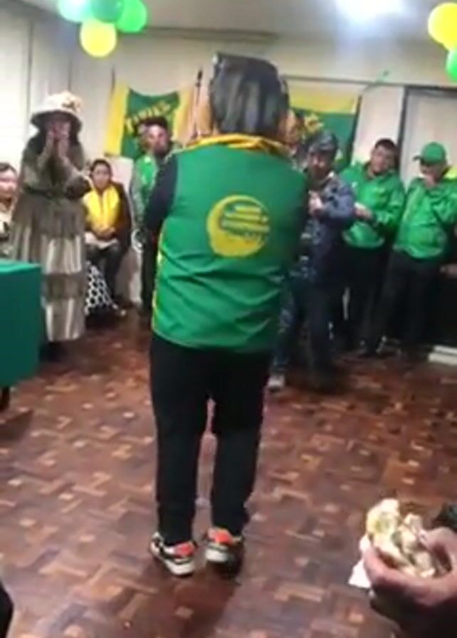 The video captures a scene of celebration indoors, likely a party or gathering with political undertones. A man wearing a green and yellow vest with the words "Kataristas Chiquiacos" on the back is the center of attention, speaking and gesturing. He is dressed in black pants and sneakers, and appears to have a grey wig, possibly part of a costume. A group of people surrounds him, some wearing similar green and yellow apparel, indicating a possible affiliation with a political movement or group. Several individuals are holding up their phones, recording the event. Balloons in green and yellow, matching the colors of the attire, are visible in the background, adding to the festive atmosphere. A flag with similar colors and possible political slogans is also visible in the background. The room has a patterned wooden floor, and the lighting is somewhat dim.
