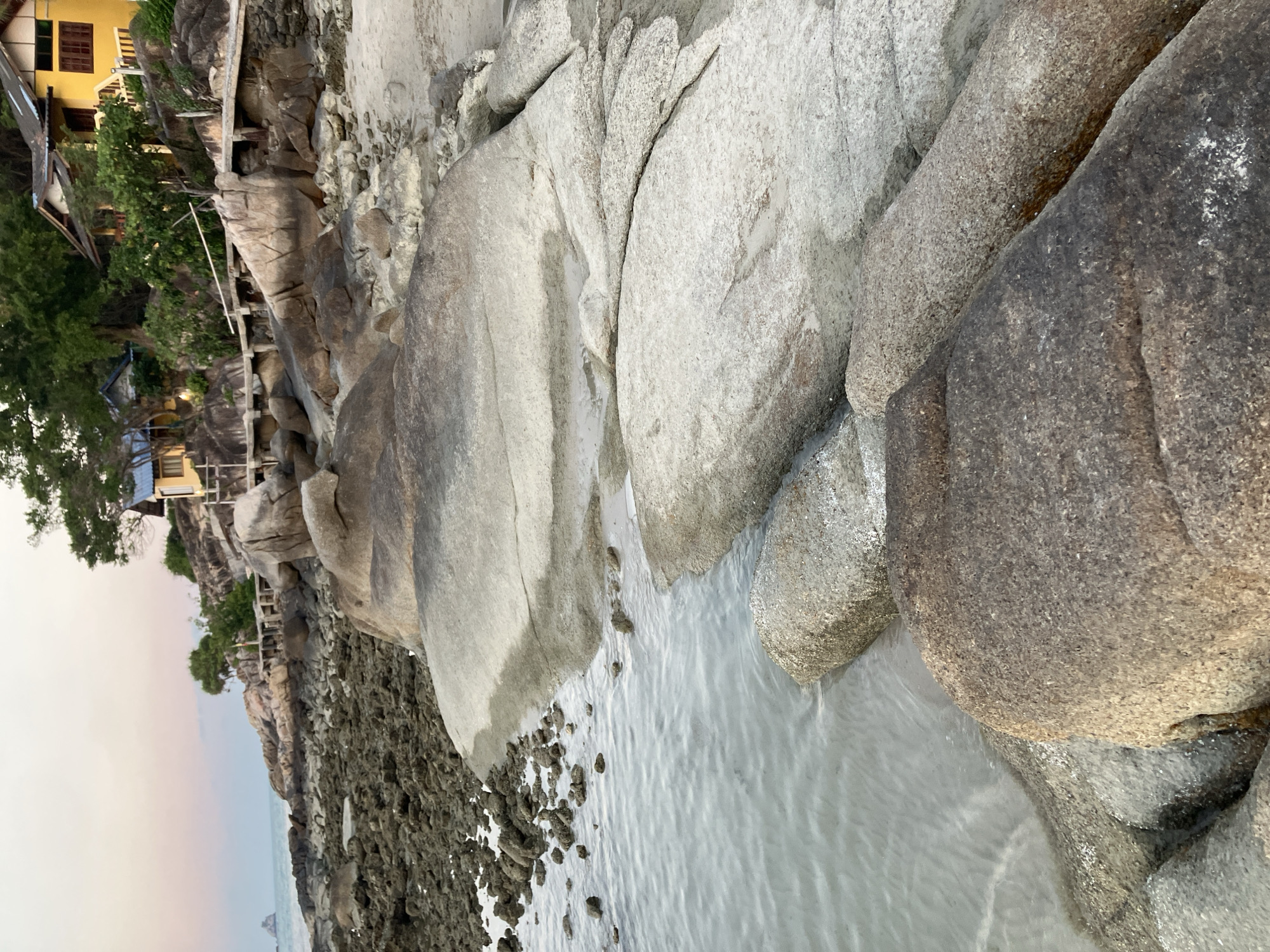rocky shoreline in Choeng Mon, Thailand, with a mix of large granite boulders and smaller, darker rocks near the waterline