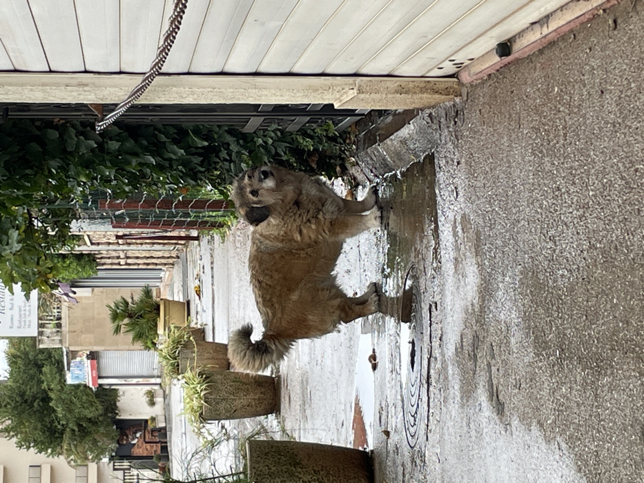 A medium-sized, fluffy dog stands on a wet sidewalk near a building. The dog has light brown fur and is looking upwards. Behind the dog, there are potted plants lining the sidewalk, and in the background, there are buildings visible down the street. The scene appears to be a street in a small town, possibly after it has rained.