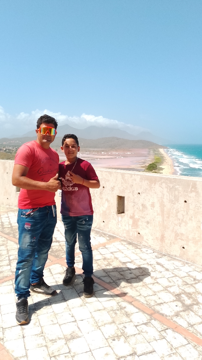 Two males are observed posing on an elevated, light-tiled outdoor platform, likely a viewpoint, overlooking the Salina de Pampatar and the Caribbean Sea in Pampatar, Venezuela