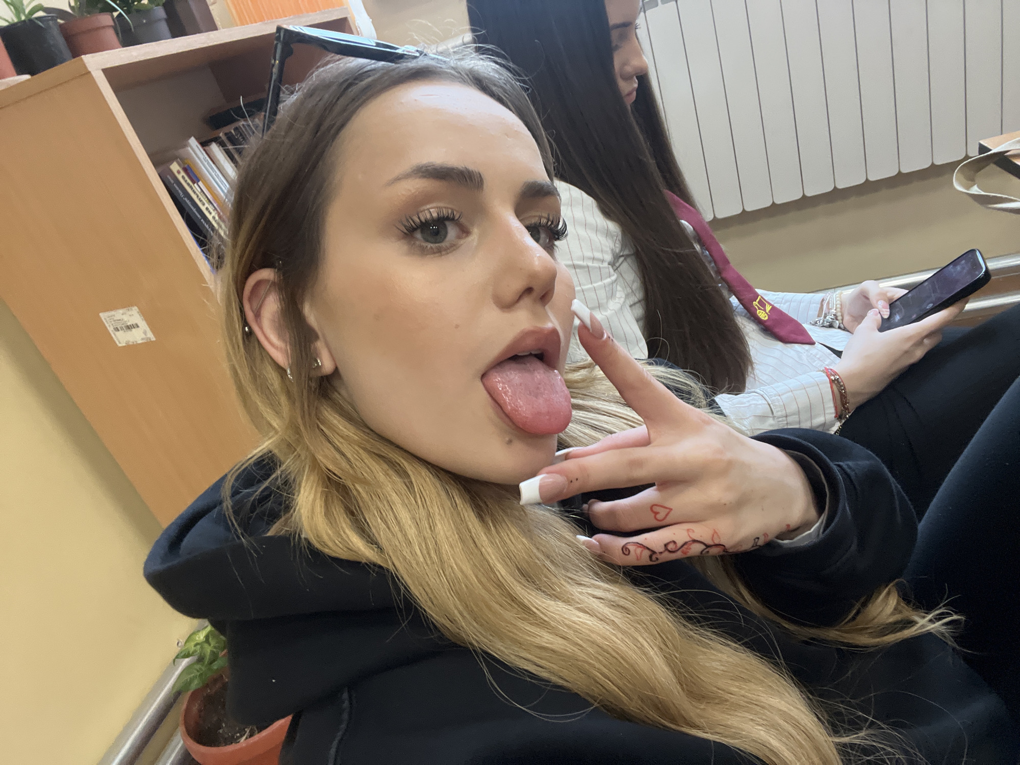 A selfie shows a fair-skinned young woman with long, blonde hair sticking her tongue out, while a dark-haired young woman sits behind her looking at a phone. The blonde woman has long, white-tipped nails and a heart-shaped tattoo on her fingers. The environment appears to be indoors, possibly in a classroom or office, with a radiator visible behind the seated woman, and a bookshelf on the left side of the frame. There is no other information available to pinpoint the location to the city of Ruse, Bulgaria.