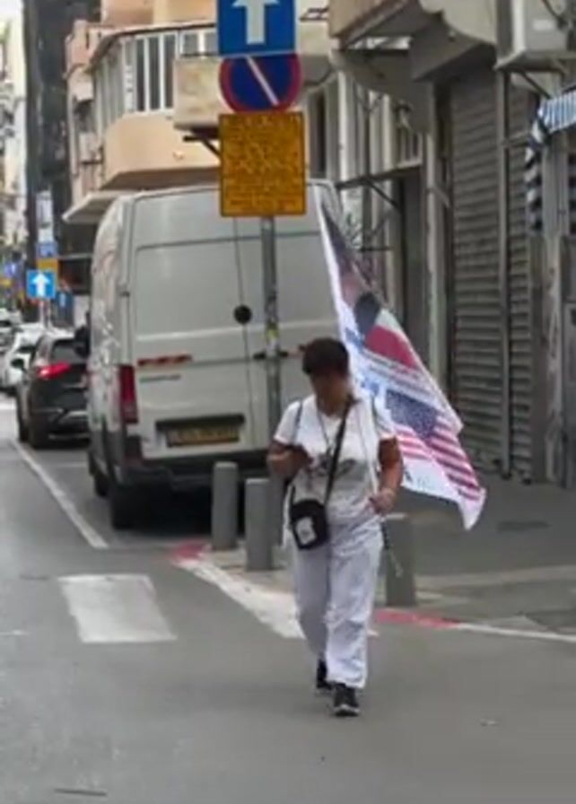 A woman walks toward the camera on a city street, looking at her phone. She is wearing white pants and a white shirt, and carries a small black bag over her shoulder. She carries an Israeli flag over her shoulder on the other side. A white van is parked on the side of the road. A crosswalk is visible. Several road signs are attached to a pole near the van. The street is narrow, with buildings on either side. Cars are lined up in the distance.
