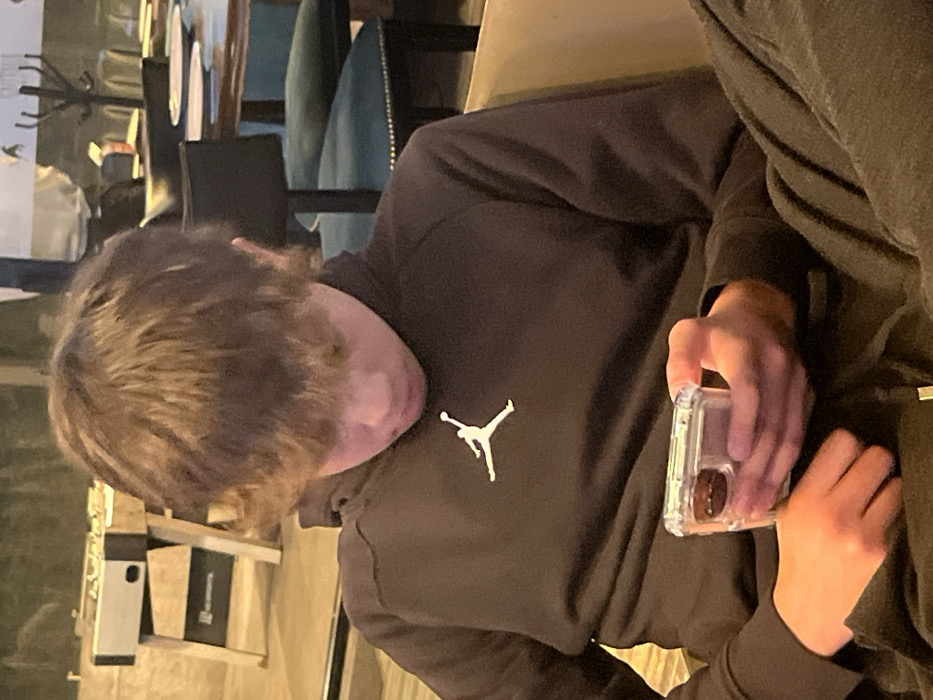 A person with brown hair and a black Jordan sweatshirt is holding a GoPro camera. The camera is in a clear case. The person is seated in what looks like a restaurant. Their face is obscured by their hair. Part of another person is visible to the right, wearing dark clothing. The background includes a table setting and chairs.