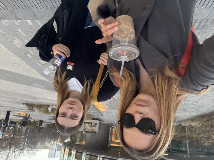 Two young women pose in front of the Denver Art Museum. One holds a "smartwater" bottle and wears a black sweater with an "ART" logo, while the other holds an iced coffee in a plastic cup and wears sunglasses and a gray coat. They stand on a paved area with trees and other buildings in the background. The image is rotated and slightly blurry.