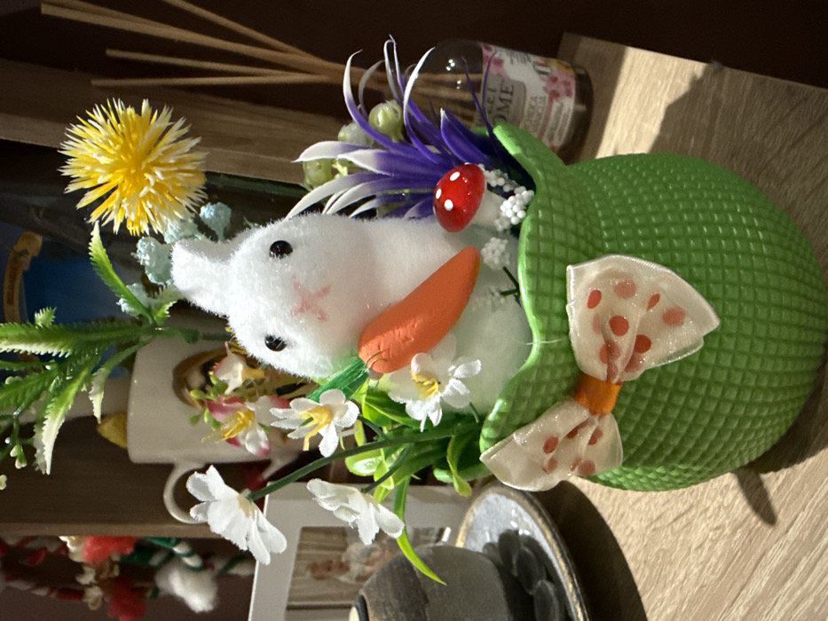 A decorative arrangement featuring a white, fluffy rabbit figurine holding an orange carrot is positioned on a light brown wooden surface. The rabbit is centered within a vibrant lime-green, textured pot adorned with a light-colored bow featuring orange polka dots. Surrounding the rabbit are artificial elements including white daisy-like flowers with yellow centers, purple spiky foliage, green grass, and a small red and white spotted mushroom figurine. In the background, on the left, a partially visible light-colored picture frame contains a blurry image of a young child. Adjacent to it, a dark spherical object rests on a gray saucer with a gold rim. Further left, out-of-focus festive decorations, including red and white stripes, are present. Directly behind the rabbit, a white mug with a graphic is visible, along with green plastic foliage and a yellow spiky artificial flower on a shelf. To the right, a glass diffuser bottle with wooden reeds, featuring a label partially legible as "IEL HOME," is present. The scene is located in Sofia, Bulgaria.