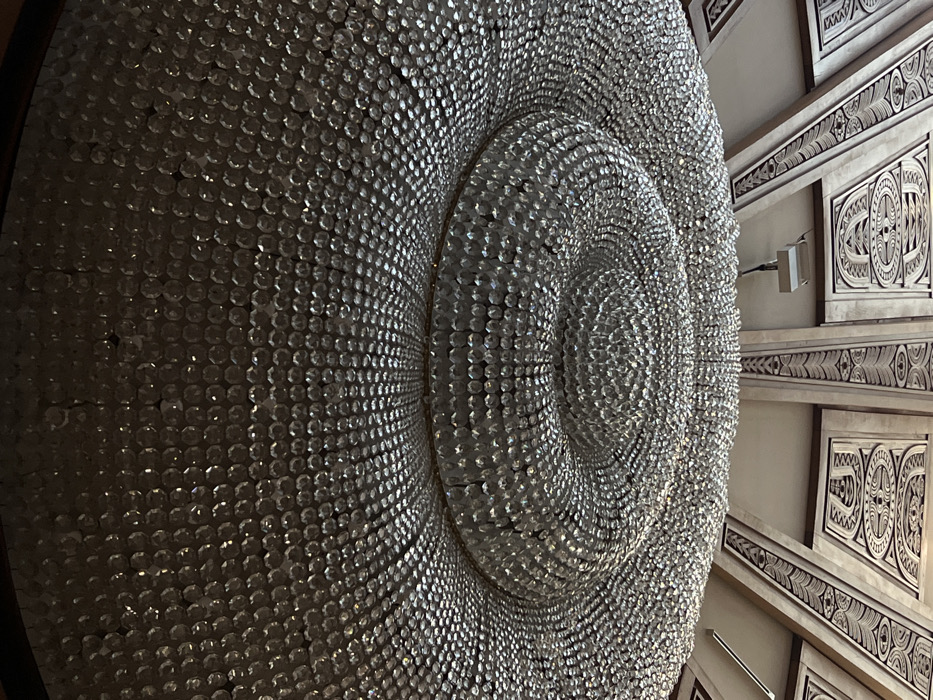 The image captures an upward view into the main hall of Cinema House (Dom na Kinoto) in Sofia, Bulgaria. Dominating the upper portion of the frame is a vast, multi-tiered crystal chandelier. It is constructed from countless small, faceted clear crystal beads meticulously arranged in concentric circular patterns, creating a shimmering, textured, and slightly domed surface that reflects light. Below and to the sides of the chandelier, sections of the hall's upper walls or ceiling supports are visible. These architectural elements are sloped and decorated with repetitive, intricate geometric patterns in dark lines against a lighter, possibly cream-colored background, indicative of an Art Deco design. A white rectangular video projector, featuring a dark lens, is mounted on one of these structural panels on the right side of the frame. No individuals or specific actions are present in the scene.
