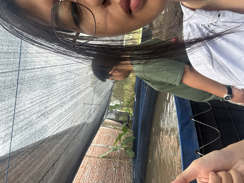 The image features a tilted selfie, with the photographer's face partially visible in the upper portion. In the background, another person wearing glasses and a green shirt stands near a blue-lined pool of murky water. A black mesh provides shade, with a brick structure visible behind it. Some green plants grow along the edge of the water. The person in the foreground is wearing a white shirt and a watch. The scene appears to be outdoors, possibly in a garden or agricultural setting.