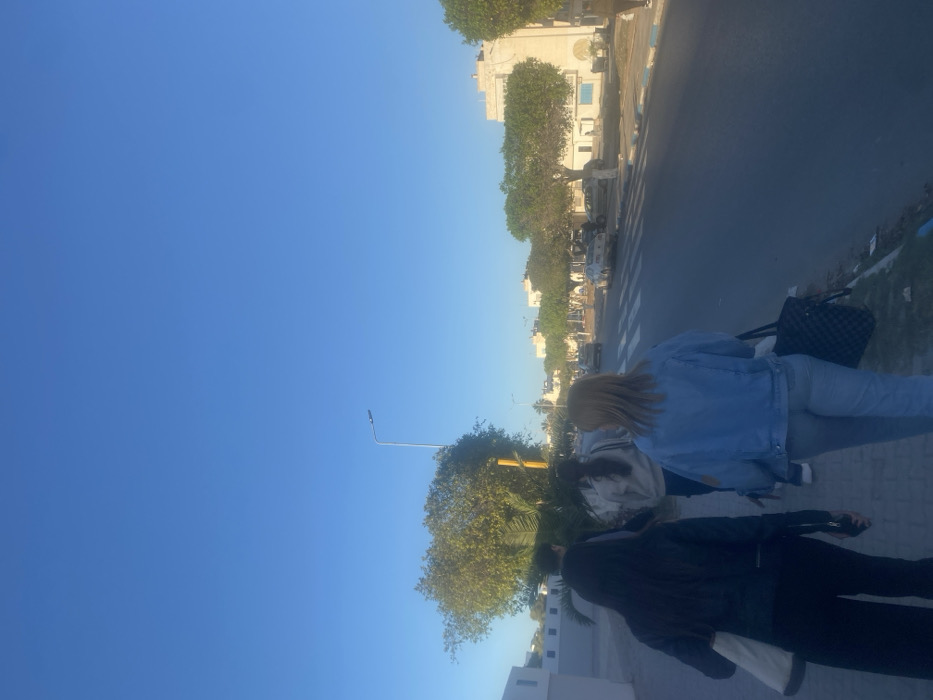 The scene depicts a daytime street view in Monastir, Tunisia. Four individuals are observed walking away from the camera on a paved sidewalk in the left foreground. The leftmost pedestrian has dark hair, wears a dark top and pants, and carries a light-colored shoulder bag. The person to her immediate right is partially obscured by her. The individual further right wears a light-colored long-sleeved top. The rightmost pedestrian, slightly ahead, has light brown hair, wears a blue denim jacket over light-colored jeans, and carries a dark, possibly patterned, shoulder bag. Adjacent to the sidewalk is an asphalt road featuring a prominent white pedestrian crosswalk. Several parked cars and at least one moving vehicle are visible on the road. The curb separating the sidewalk from the road is painted in distinct blue and white sections. The environment includes mature green trees and palms lining the street, with a modern streetlamp positioned on the left side. In the background, multiple light-colored, multi-story buildings with flat roofs are visible, consistent with urban architecture. The sky is clear and a vibrant blue.