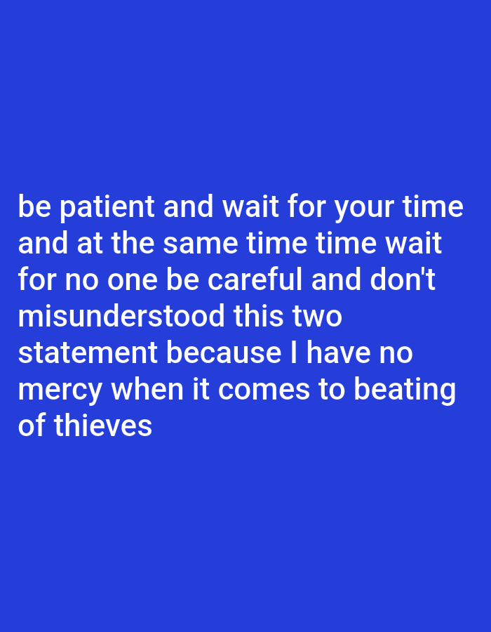 The image depicts white, sans-serif text against a solid royal blue background. The text is arranged in multiple lines and reads: "be patient and wait for your time and at the same time time wait for no one be careful and don't misunderstood this two statement because I have no mercy when it comes to beating of thieves." There are no individuals, other objects, or discernible actions present. The environment is limited to the digital display of this textual message. Location: Unknown, Unknown.
