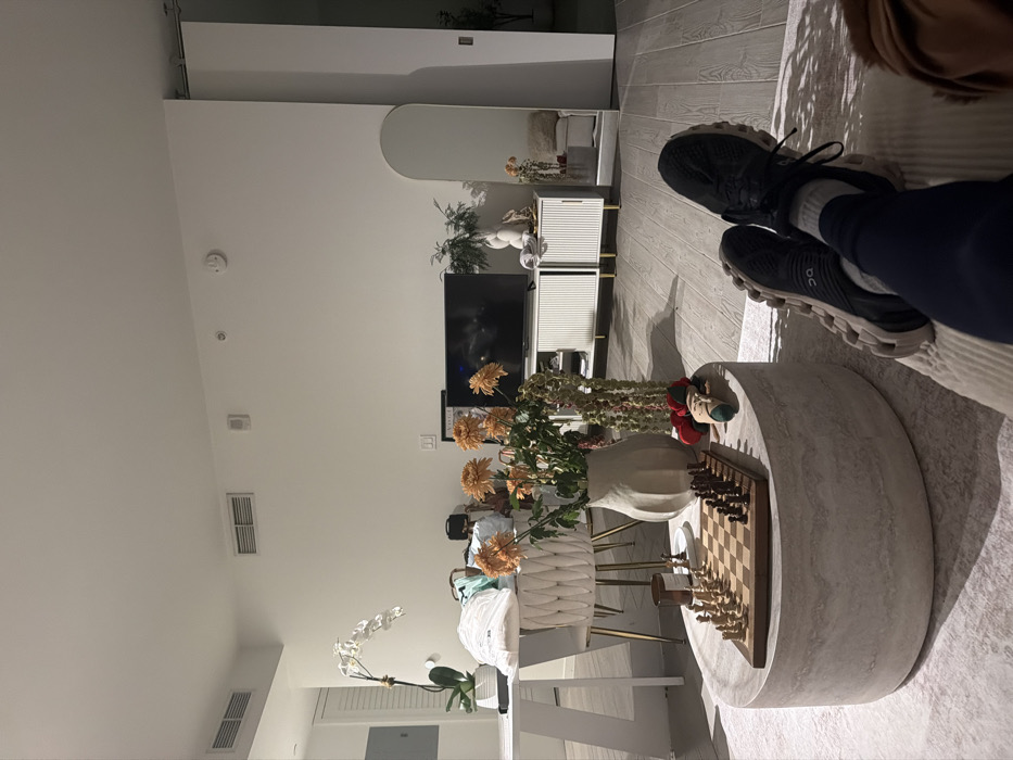 A modern living room features a round coffee table with a chess set, surrounded by a vase of orange flowers and other decorative items. A TV and entertainment center are visible in the background, along with a full-length mirror. On the sofa, a person wears black running shoes. The room is bathed in soft light, highlighting the neutral color palette of the decor.