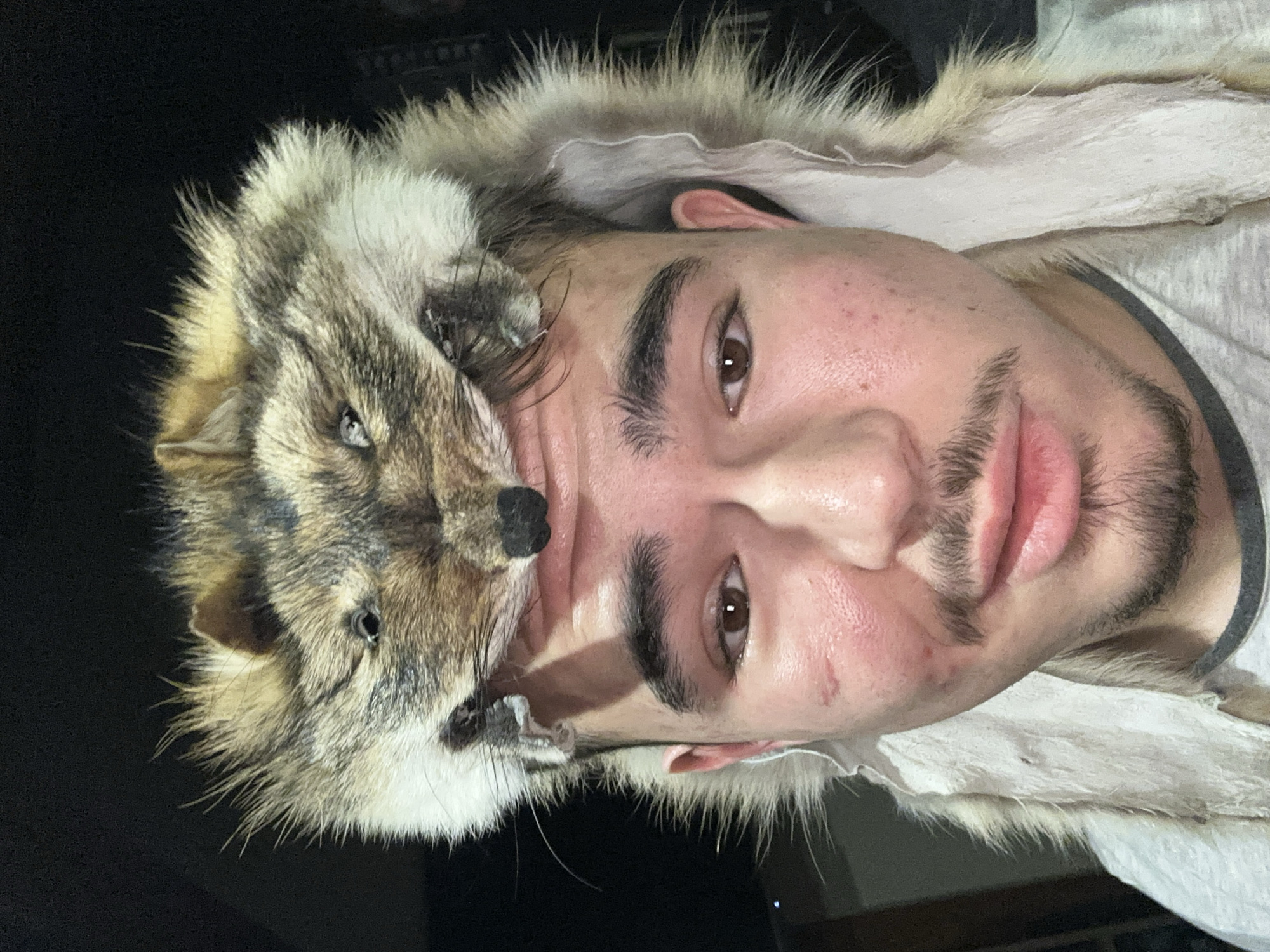 A young adult male is depicted in a close-up, chest-up portrait against a dark, undifferentiated background. He has a light skin tone, dark hair, dark eyebrows, a mustache, and a short goatee. A visible scar is present on his left cheek. He is wearing a light-colored t-shirt. The male subject is wearing a hat constructed from an animal pelt, featuring the head of a canid, likely a fox, positioned centrally on his forehead. The animal's head displays artificial eyes and a black nose. The fur, a mix of brown, tan, and cream, drapes over the sides of his head and shoulders, with the lighter underside of the pelt visible. The subject is looking directly at the viewer with a neutral to slightly smiling expression. The specific location within Voluyak, Bulgaria, is not discernible from the visual evidence.