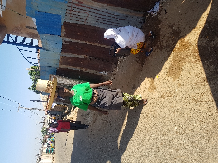 The scene depicts a daylight street view in Jos, Nigeria, characterized by an unpaved road and residential/commercial structures
