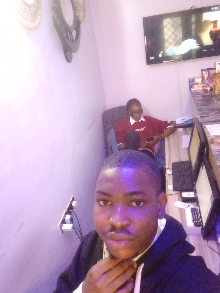 This image depicts an indoor scene in the city of Igrwre-Ovie, Nigeria, featuring two individuals within what appears to be an office or commercial setting