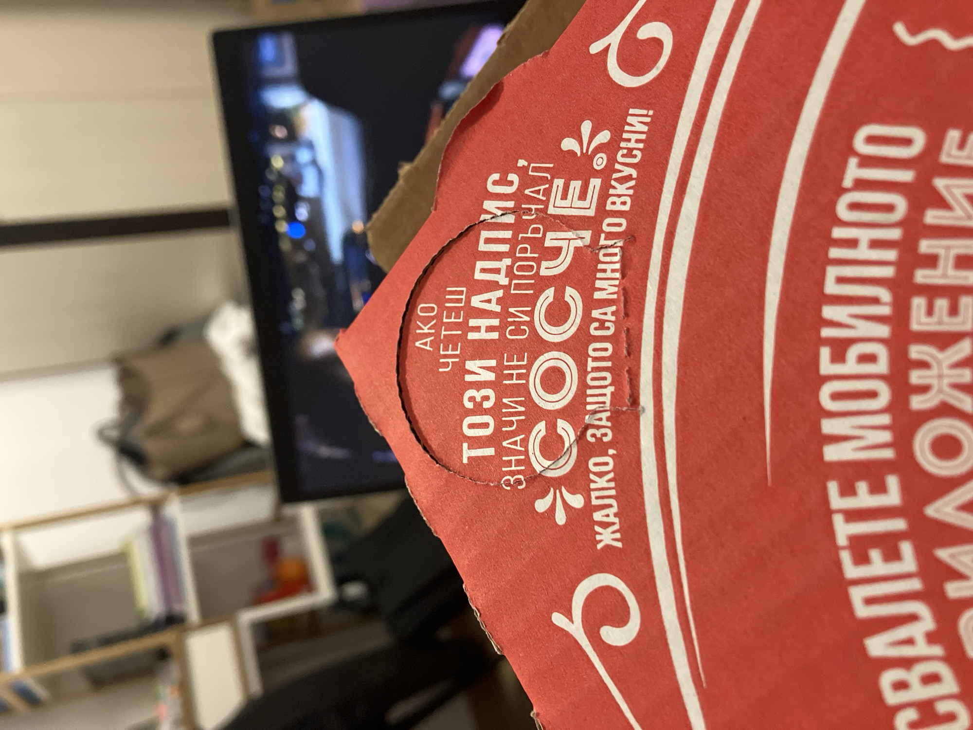 A red cardboard container, likely for food delivery, dominates the foreground, featuring white text in Bulgarian: "АКО ЧЕТЕШ ТОЗИ НАДПИС, ЗНАЧИ НЕ СИ ПОРЪЧАЛ СОСЧЕ. ЖАЛКО, ЗАЩОТО СА МНОГО ВКУСНИ!" (If you are reading this inscription, it means you haven't ordered a SAUCE. Too bad, because they are very tasty!), along with partially visible instructions to "DOWNLOAD THE MOBILE APPLICATION." A circular, perforated tear is evident on the container's upper surface. In the blurred background, a dark monitor displays a dynamic, illuminated night scene, possibly from a video game, characterized by blue and white lights. To the left, a light-colored shelving unit with wooden accents and white shelves holds various indistinct objects, including a beige bag, within what appears to be an indoor residential setting in Plovdiv, Bulgaria.