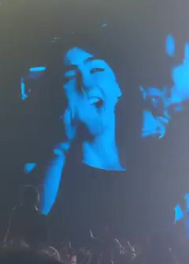 The video appears to be taken at a concert. In the first frame, a large screen displays a woman singing with her mouth open. The scene then quickly transitions to darkness before brightening again to reveal a crowded audience with bright stage lights and a large screen displaying abstract blue graphics. The video ends with a view of the stage, barely visible through a haze of light.