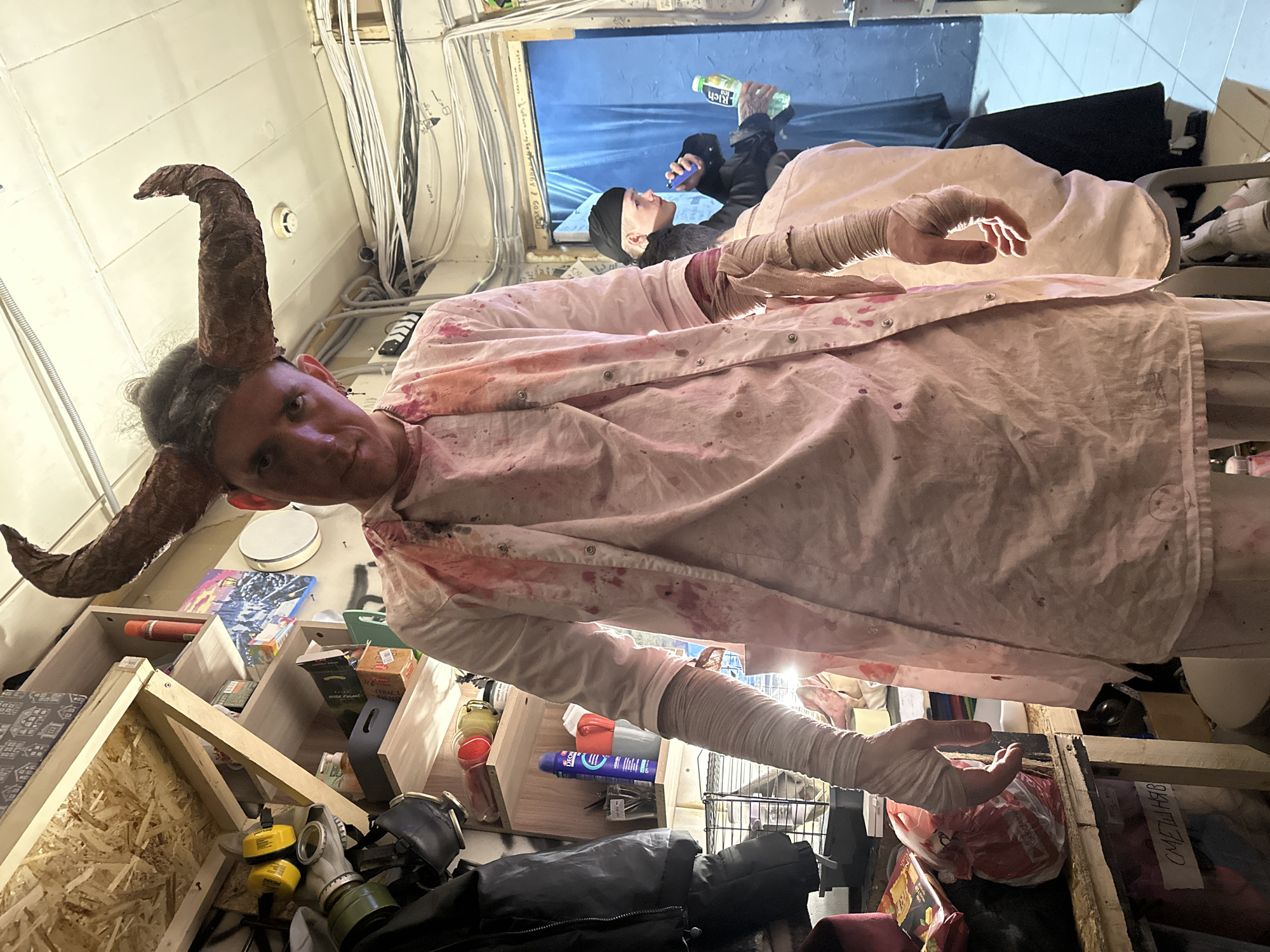 A low-angle, canted view shows two people within what appears to be an interior set. The foreground features a person with large, curved brown horns attached to their head, suggesting a costume. The person wears a white, button-down shirt that has splatters of red, resembling blood. Bandages are wrapped around their forearm and hand. The environment surrounding them includes shelves filled with miscellaneous items, gas masks, containers, and wooden structures. In the background, visible through a doorway, is another person dressed in dark clothing and a black beanie, holding and appearing to drink from a green bottle. They are situated against a blue backdrop. There is no information to corroborate this location being in Saratov, Russia.