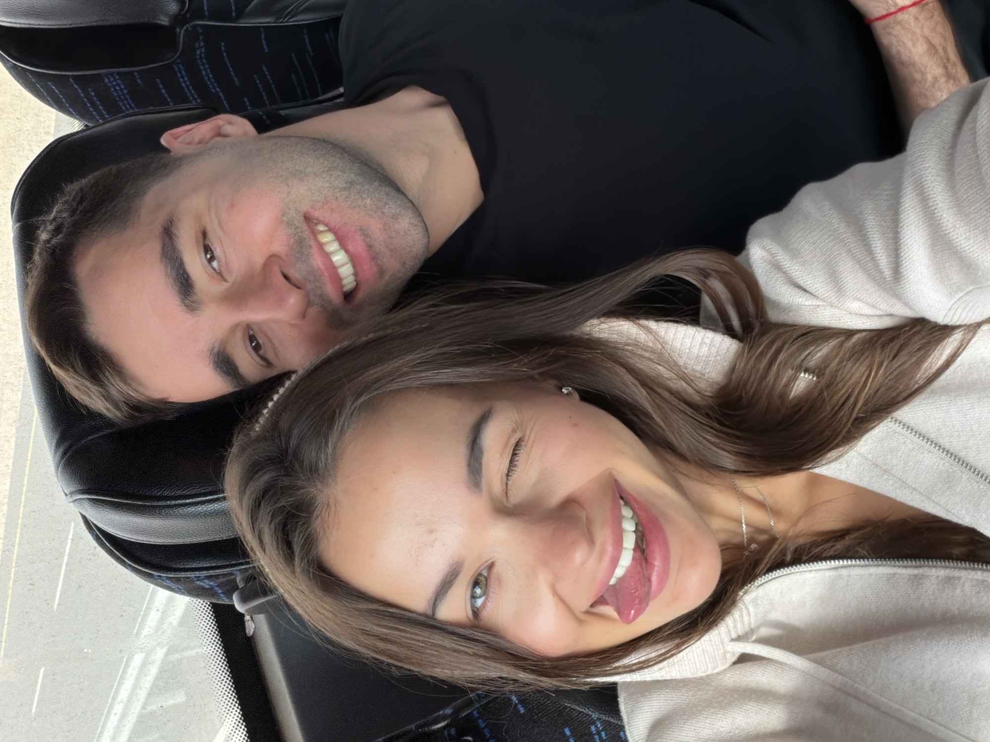 A selfie captures a young adult female and male inside a moving vehicle, likely a bus or large van, characterized by black, ribbed seating with blue patterned inserts