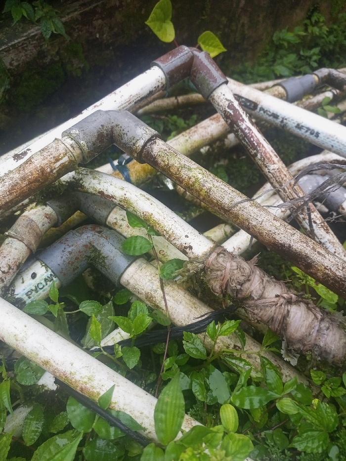 - "The scene, situated in Zee Pin Kone, Myanmar, depicts a close-up view of a disordered collection of weathered white PVC pipes discarded amidst dense green vegetation" by FM-M4QOC3, licensed under CC BY 4.0