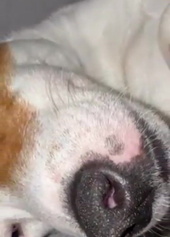 A Jack Russell Terrier lies on its back inside a gray, plush dog bed. The dog's coat is mostly white with tan markings on its head and sparse black spots on its belly. The dog is sleeping soundly with its paws curled up and its dark nose prominently displayed. The camera slowly zooms out to reveal the dog's full body stretched out comfortably in the cozy bed.