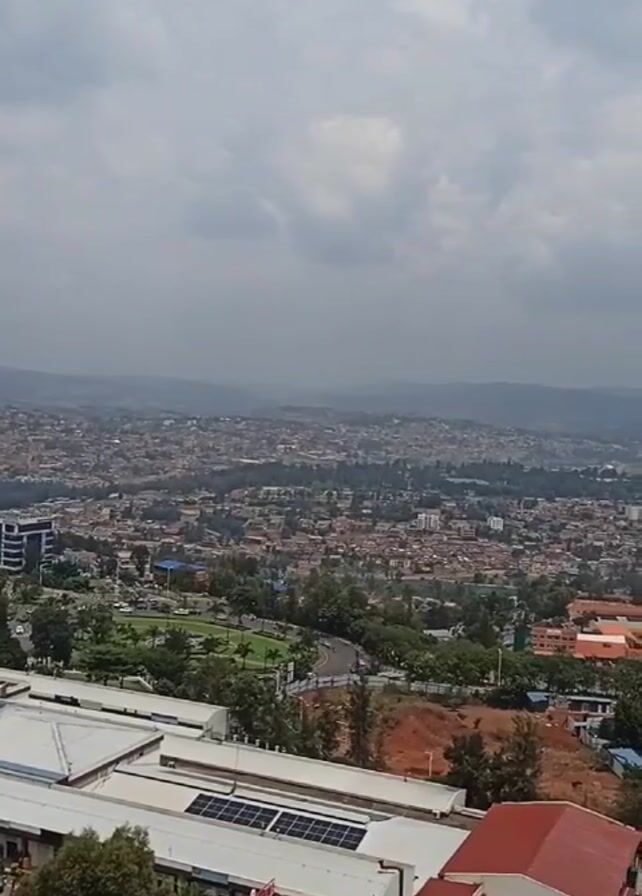 The video showcases a broad aerial view of a city spread across a hilly landscape. The sky overhead is overcast with dense clouds. In the foreground, there are rooftops of several buildings, one notable for its solar panels, and a red roof. A tall building stands on the left side. The cityscape in the distance is characterized by dense, mostly low-rise buildings interspersed with patches of greenery and trees. The landscape gently rises towards the horizon, where faint hills or mountains are visible. The overall tone is muted, owing to the overcast weather.