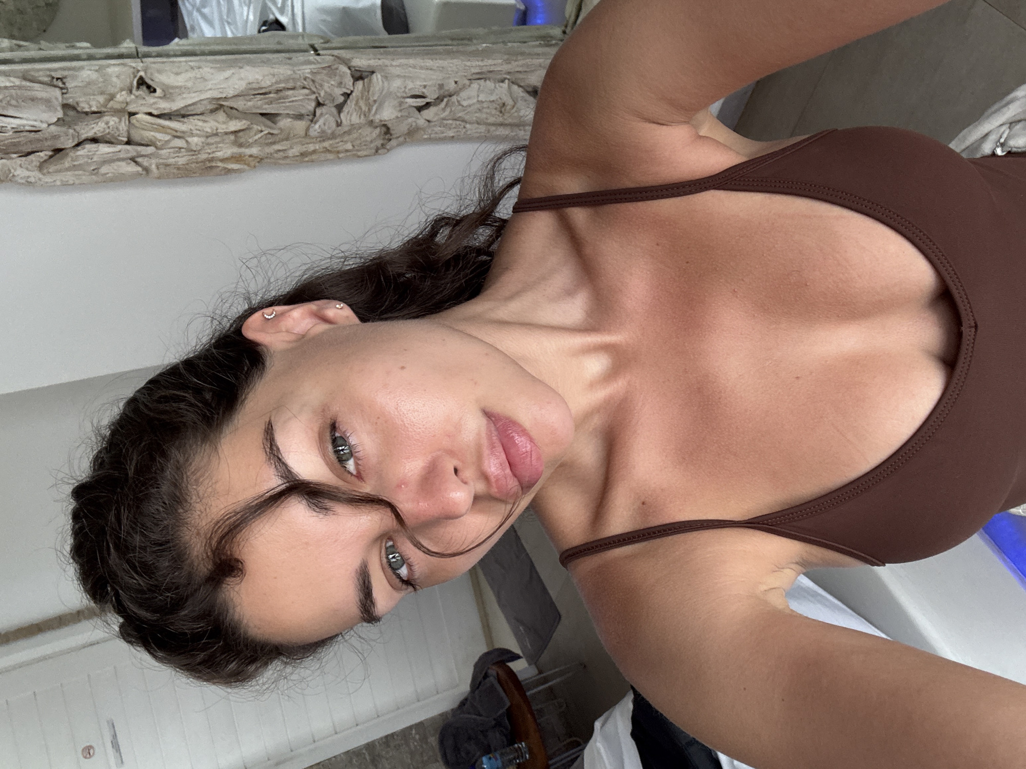 A woman with long brown hair is posing for a selfie. She has fair skin, green eyes, and is wearing a brown top with spaghetti straps. Her head is tilted to the side. The background includes a wall with a textured, stone-like surface and a mirror. The location is Unknown, Indonesia.