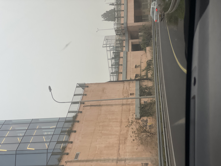 The image displays an outdoor scene from a vehicle, overlooking a curved asphalt road under an overcast, hazy sky in Givat Hen, Israel. On the left, a multi-story building with a reflective glass facade rises above a large, peach-colored concrete retaining wall. The glass facade shows linear reflections of interior lighting. The retaining wall is textured, exhibiting vertical cracks, discolored patches, and extensive growth of green ivy at its base. A solitary grey streetlamp stands centrally in front of this wall. To the right, a complex peach-colored concrete elevated structure, possibly an overpass or pedestrian bridge, features multiple levels and segments with dark metal railings. Sparse vegetation, including dry grasses and small shrubs, grows along the base of these structures and adjacent to the roadway. The asphalt road in the foreground displays double white lines and a yellow curved line. Metal guardrails line the right side of the road. A silver sedan, oriented away from the viewer, is visible on the far right lane, with a dark bumper attachment or damage visible on its rear. No individuals are visible in the scene. The dashboard of the viewing vehicle occupies the bottom portion of the frame.