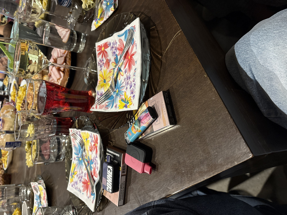This image captures a close-up, high-angle view of a dark wooden dining table during a social gathering in Lozen, Bulgaria. In the immediate foreground, the mid-section and upper legs of an individual wearing blue denim jeans are visible, seated at the table. On the table surface, personal items are arranged: a black "CONNEX" branded vape device rests on top of a cigarette pack (partially obscured, with Cyrillic text visible); adjacent to it is a pink and black vape device; further right, a pack of "DELUXE SELECT" cigarettes lies next to a lighter featuring a 'Baby Yoda' graphic. The table is set with multiple dark, translucent plates, each topped with a square white paper napkin displaying a vibrant, multi-colored floral pattern (blue, red, yellow, and purple flowers). A silver fork is positioned on each visible napkin. Various beverages are present: a tall glass containing a red liquid, a stemmed glass holding white wine, and several other glasses containing clear liquid or appearing partially empty. In the blurred background, platters of food are visible, including piles of yellow fried items (resembling french fries or crisps) and slices of cured meat. Multiple indistinct human figures are seated around the table, suggesting a group dining event.