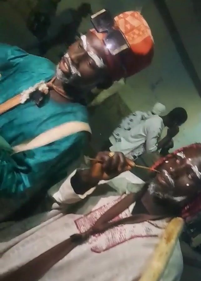 two men in traditional clothing, possibly performers or celebrants, holding and apparently smoking from light-colored sticks or pipes. Their faces are adorned with white markings. They stand among a group of men, some kneeling, in what appears to be a dimly lit indoor space. The camera moves erratically, changing focus and angles throughout the recording.