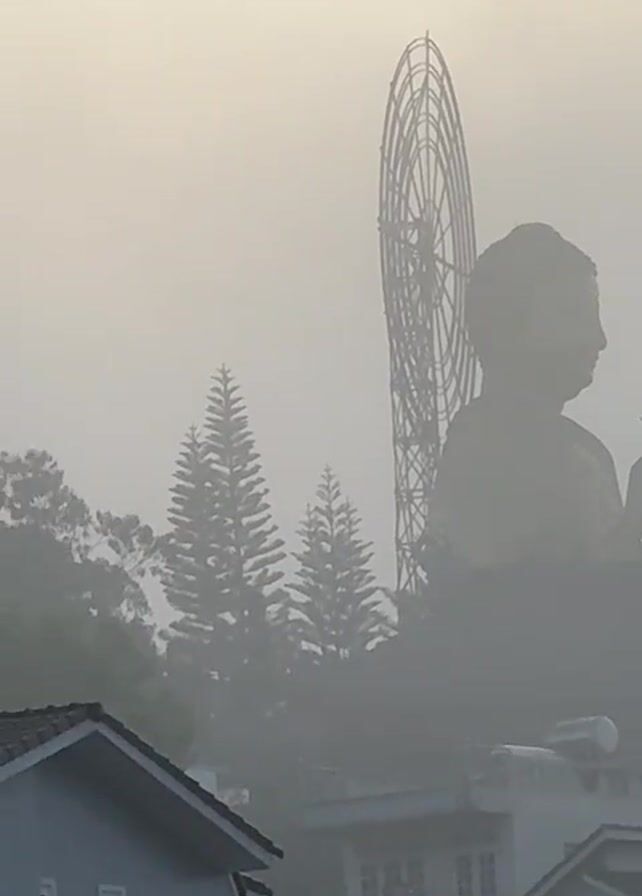 hazy landscape with buildings, trees, and a Ferris wheel-like structure in the background. A statue holding a flower is visible, partially obscured by the fog. The camera pans across the scene, revealing a multi-tiered building with architectural details. The overall atmosphere is foggy and overcast.