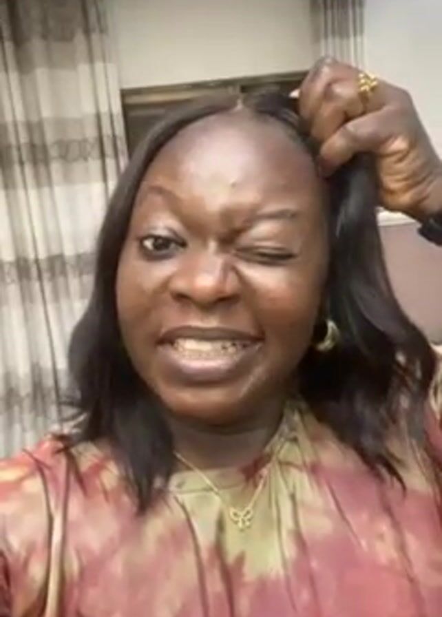 woman indoors, facing the camera. She is wearing a tie-dye shirt, large gold hoop earrings, and a gold necklace with a bow-shaped pendant. Initially, she is holding a section of her long, black hair, then pulls it back to reveal neat, short cornrows. She smiles briefly. Behind her are curtains and a glimpse of a sofa.