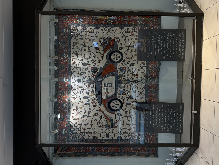 A large, ornately patterned Oriental rug is displayed vertically within a glass and dark-framed enclosure, likely a storefront window or mall display case. The rug's central design features a stylized side profile of a white, orange, and blue racing car, specifically resembling a Porsche with "MARTINI" branding and the number "5" on its side, against a cream-colored field with traditional curvilinear floral and vine motifs in red, blue, green, and brown. The rug is illuminated from above by multiple track lights. Reflections of the surrounding environment are visible on the glass. Inside the display, two identical black rectangular signs with white text identify "ORIENTAL RUG BAZAAR" and state their "WORLD HEADQUARTERS LOCATION" at "3601 W. ALABAMA," noting it is "BLOCKS FROM THE GALLERIA" in Houston, Texas, United States of America. The signs further instruct visitors to call a phone number (713-960-9070) for a driver pick-up at "THE GALLERIA VALET STAND OUTSIDE CHEESECAKE FACTORY" and state, "WE SHIP RUGS WORLDWIDE!" The floor in the foreground consists of light-colored square tiles. No individuals are visible in the scene.