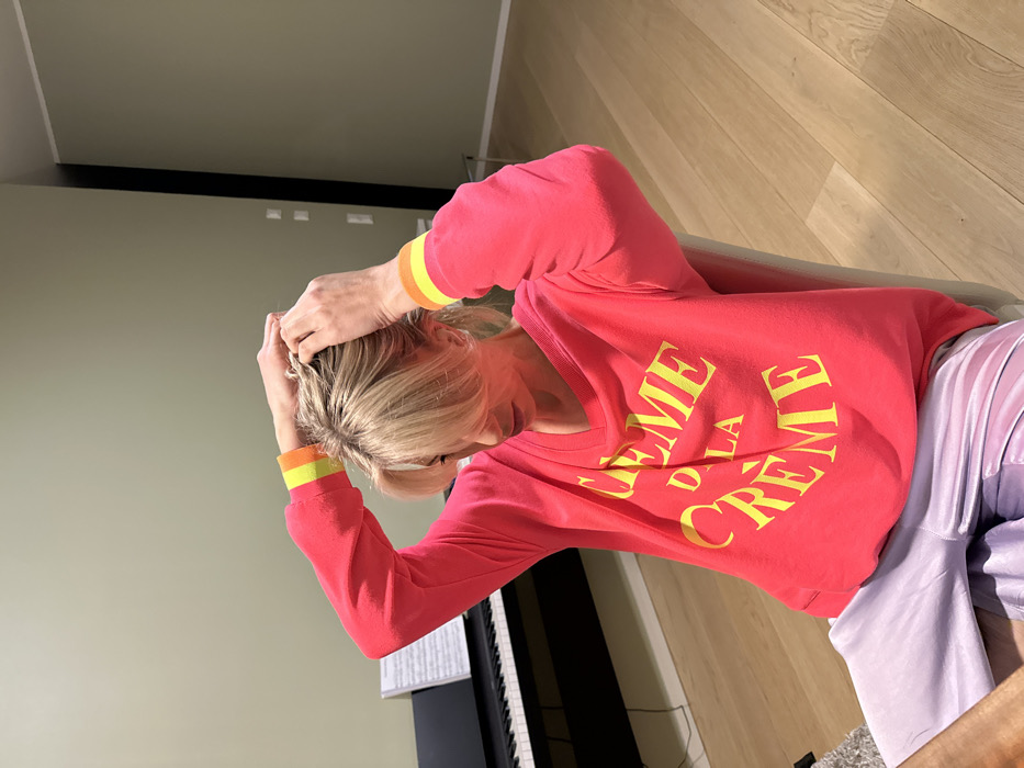 A woman with blonde hair is seen from a high angle. She is wearing a bright pink sweatshirt with the words "CREME D LA CREME" in yellow. The sweatshirt has yellow and orange stripes on the cuffs. Her hands are raised to her head as if styling her hair. She is also wearing light purple satin shorts. A piano is partially visible in the background, along with a light green wall and wooden flooring.