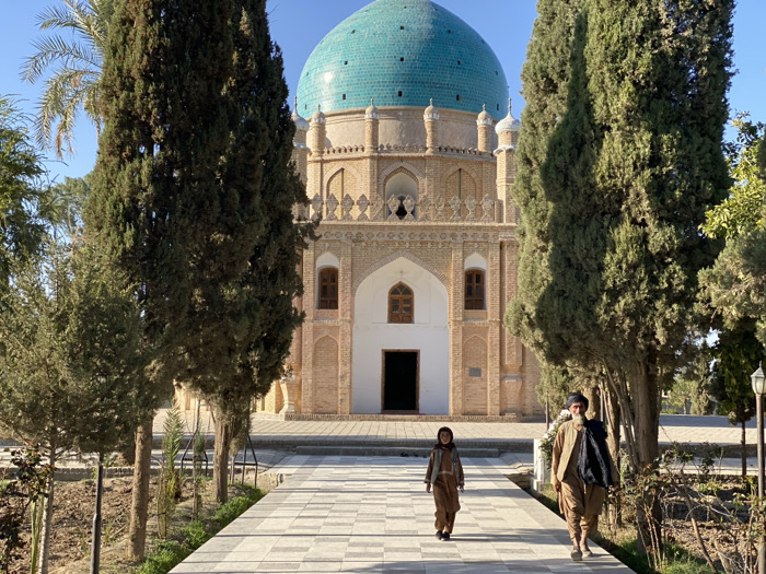 The photo shows a wide shot of a large, ornately decorated building with a turquoise dome located in the city of Kandahar, Afghanistan, at the coordinates (latitude: 31.618, longitude: 65.604). The building, with its dome and ornate details, appears to be a mosque or a shrine. It stands on a slightly elevated platform with a tiled pathway leading to its entrance, flanked by two rows of trees on either side. Two individuals, one a man and one a young boy, walk along the pathway towards the entrance of the building. The man wears a long dark coat over a white shirt and the boy wears a long tan robe and a brown cap. Both are wearing sandals. The environment is characterized by a sunny day with a clear blue sky and manicured grounds around the building. The scene suggests a place of worship or a religious site. The individuals in the photo appear to be visiting or perhaps leaving the building, highlighting the significance of the site.