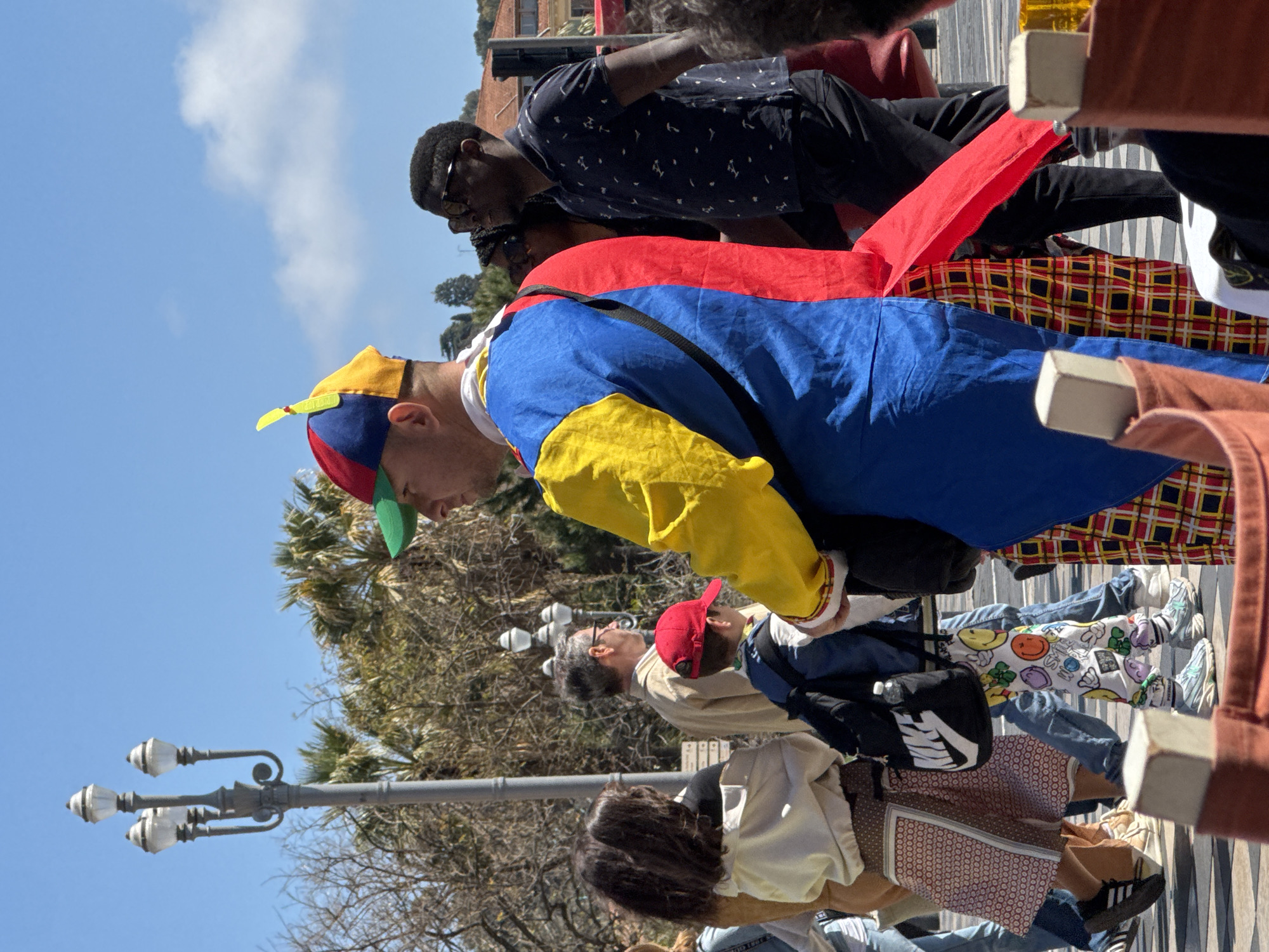 In an outdoor scene in Nice, France, a group of people are positioned near a street. A man wearing a brightly colored jacket with yellow sleeves, a blue torso, and a red stripe across the back is in the foreground. He has a multi-colored hat with a small propeller on it. To his right is a black man with sunglasses wearing a patterned shirt. The man in the colorful jacket is leaning forward. Further down the line, a man in a red hat and another person in a light-colored jacket can be seen. Several streetlights are positioned near trees. The overall lighting suggests it is daytime with a partly cloudy sky. The people appear to be part of a group or gathering, observing something in front of them.