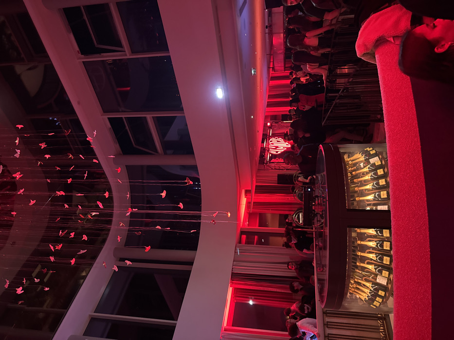 A modern, high-ceilinged interior, illuminated by red lighting. A large window showcases a decorative art installation of suspended, pink, jellyfish-like forms. A bar area is lined with people seated on stools. Behind the bar is a display of wine bottles and a brightly lit logo. The space appears to be a fashionable lounge or restaurant.