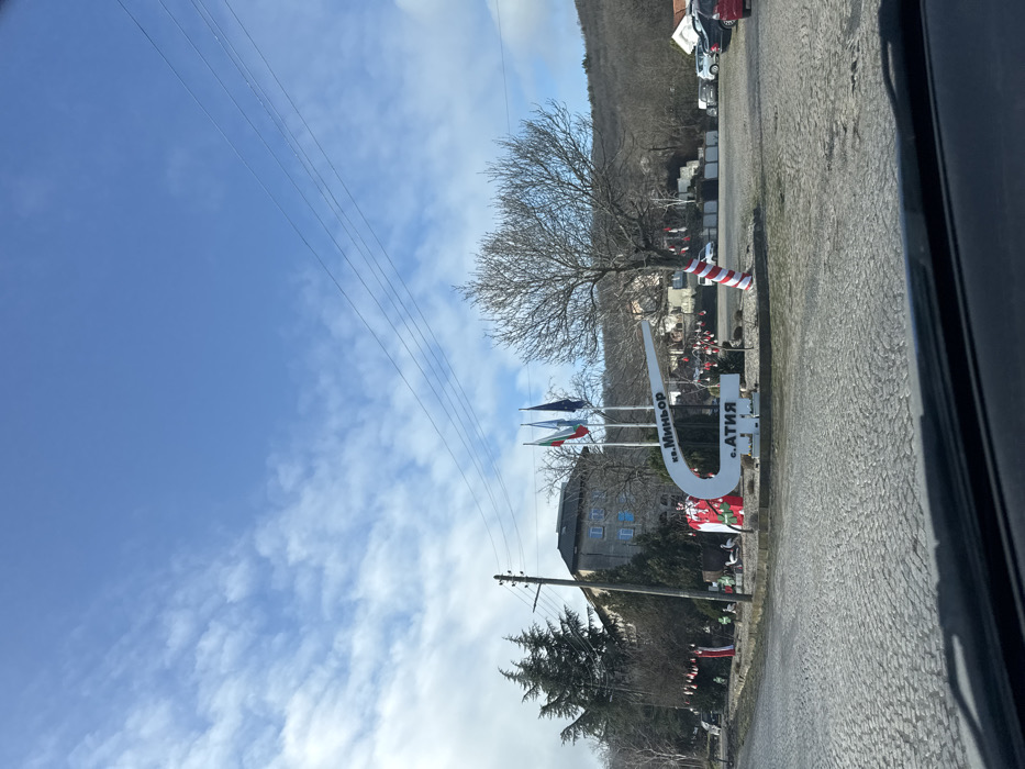 The image presents an outdoor scene in the village of Atiya, Bulgaria, specifically at an entrance point featuring a sign for "кв