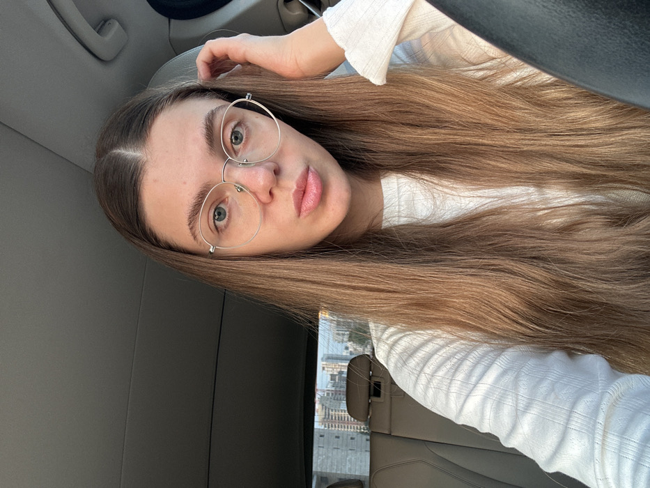 A young adult female is depicted in a close-up, head-and-shoulders portrait taken inside a vehicle