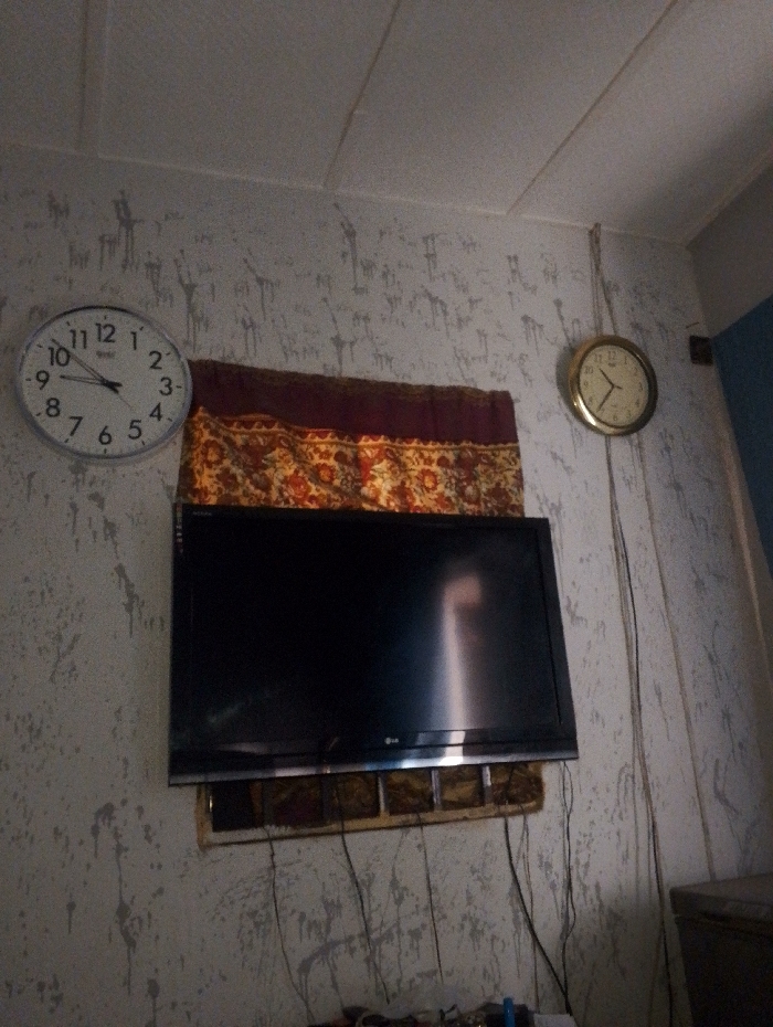 A flat-screen television hangs on a wall with mottled wallpaper, positioned beneath a decorative textile. To the left, a clock with a white face reads approximately 10:55. To the right, another clock with a gold frame indicates the time is just before 4:00. Electrical wires dangle from behind the TV and run down the wall. The room appears cluttered, with a glimpse of objects near the floor. The ceiling is white and paneled.
