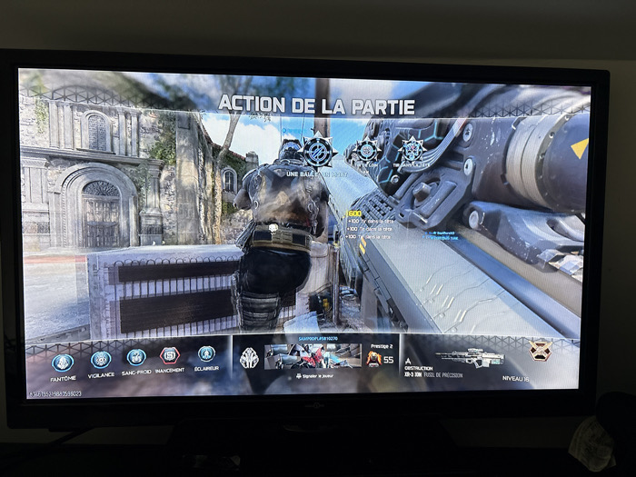 A digital photograph captures a television screen displaying a video game in progress. The game interface, primarily in French, shows "ACTION DE LA PARTIE" (Action of the Game) at the top. The scene depicts a third-person perspective of a heavily armored player character standing behind a low, light-colored concrete barrier. The character holds a large, futuristic-looking rifle over the right shoulder. To the right, a detailed view of the weapon's scope and barrel occupies a significant portion of the screen, indicating a first-person perspective or weapon focus. On-screen display elements include score updates such as "+600" and "+100 tir dans la tête" (headshot), along with various perk icons labeled "FANTÔME," "VIGILANCE," "SANG FROID," "AVANCEMENT," and "ÉCLAIREUR." A weapon description identifies "EX-3 30M FUSIL DE PRÉCISION" (EX-3 30M Precision Rifle) at "NIVEAU 18" (Level 18) for a player at "Prestige 2, 55". The virtual game environment features weathered stone buildings with ornate architectural details, including large arched doorways and windows, and sections overgrown with ivy. This architecture is reminiscent of historic European Gothic or Romanesque styles. This depicted environment is a fictional game map and does not represent a specific, real-world location within the city of Saint-Denis, France. The scene is static, representing a paused moment or replay within the game.