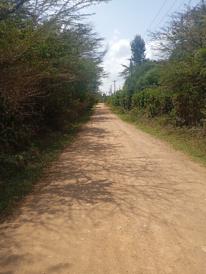 The scene depicts a narrow, unpaved dirt road, light brown in color, receding into the distance under a clear sky with scattered white clouds. The road is flanked on both sides by dense vegetation consisting of bushes and trees, with more sparse, dry-looking foliage on the left and denser green foliage on the right. Shadows of tree branches are cast across the road. Utility poles supporting power lines are visible along the right side of the road in the mid-ground, extending towards the horizon. A tall, slender tree stands prominently against the sky on the right side in the distance. No individuals, animals, or vehicles are present. The location is Mosop ward, Kenya.