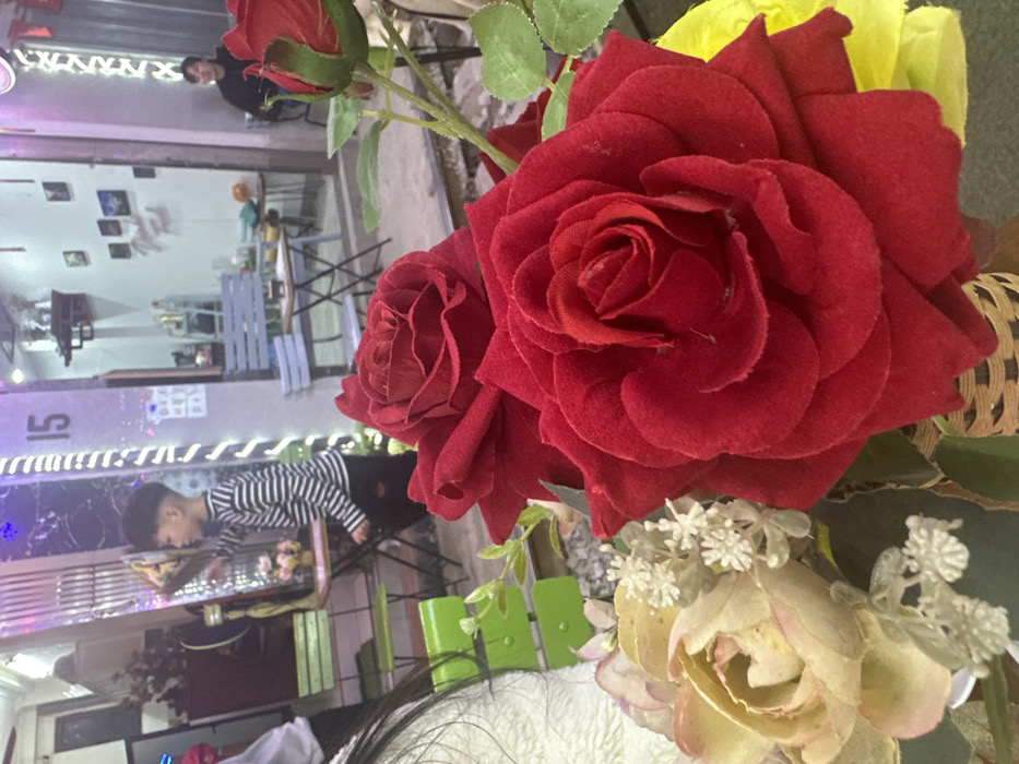 - "The image displays an urban street scene in Hà Nội, Vietnam, at night, viewed through a foreground of artificial red, yellow, and beige roses in a woven container" by FM-S4vcm1, licensed under CC BY 4.0